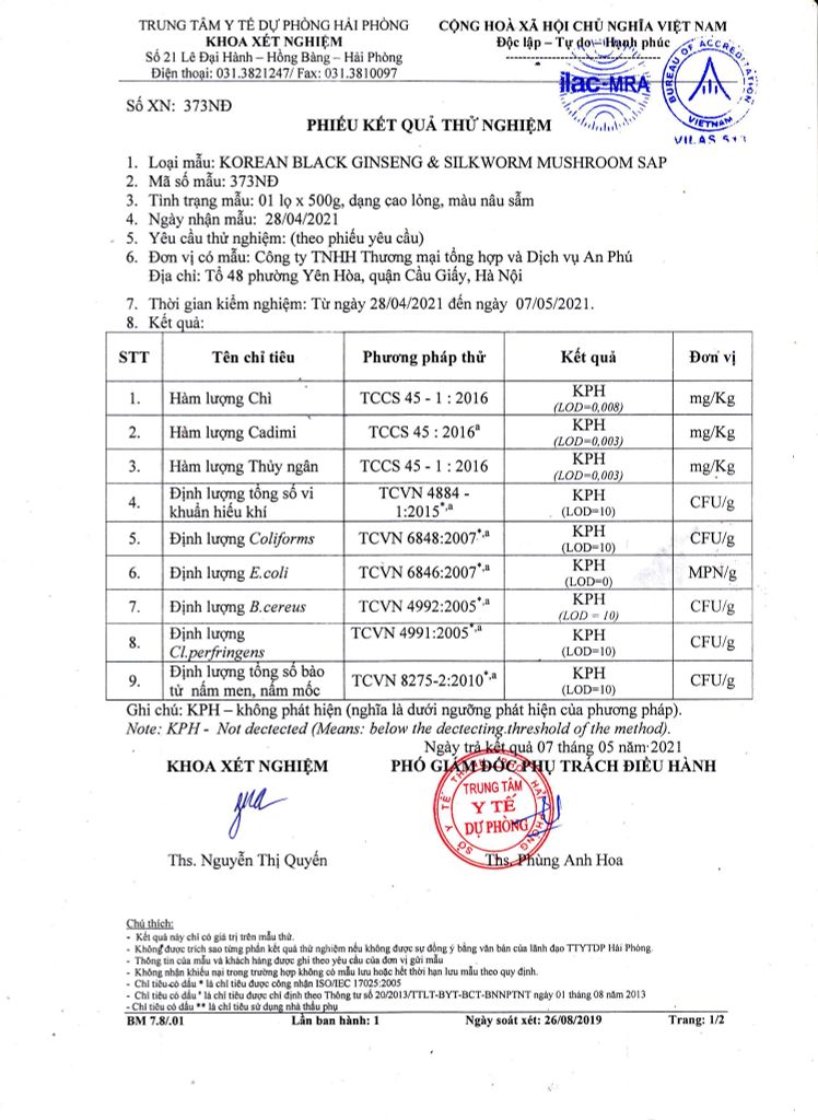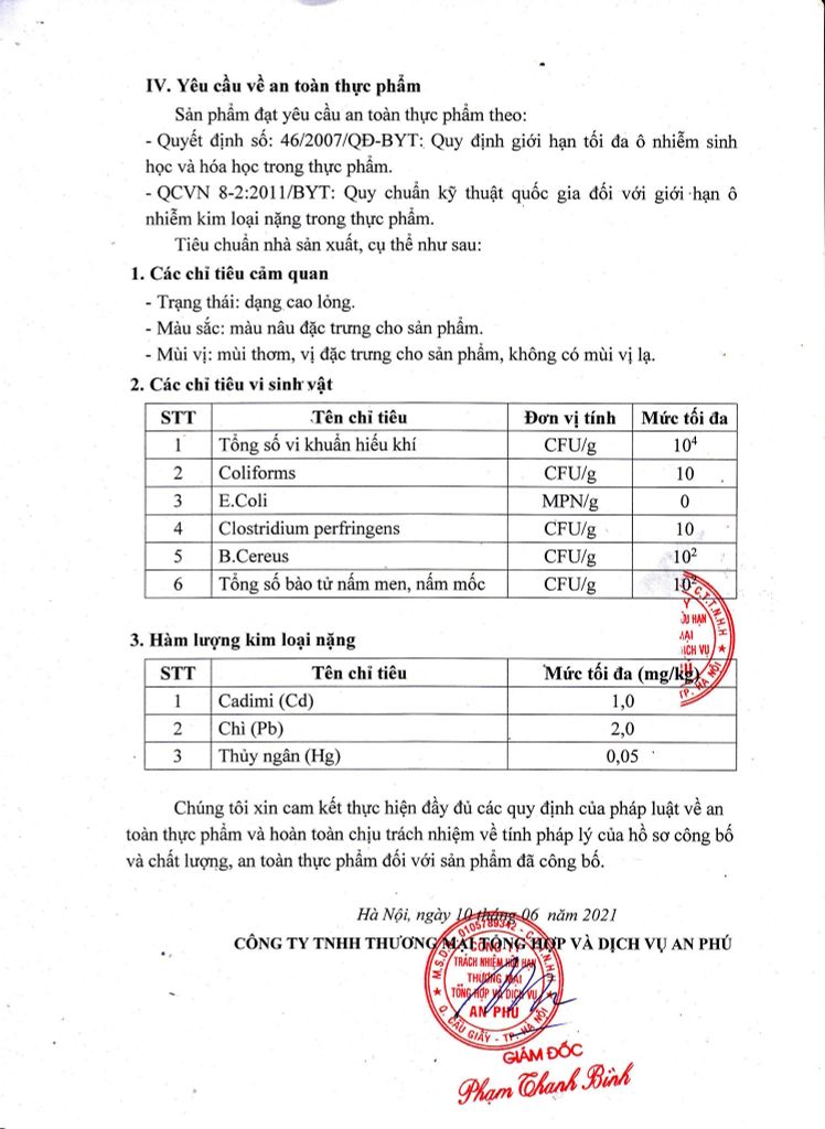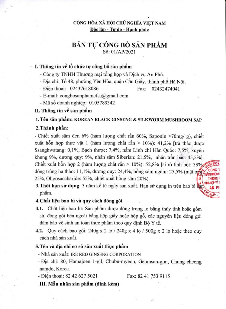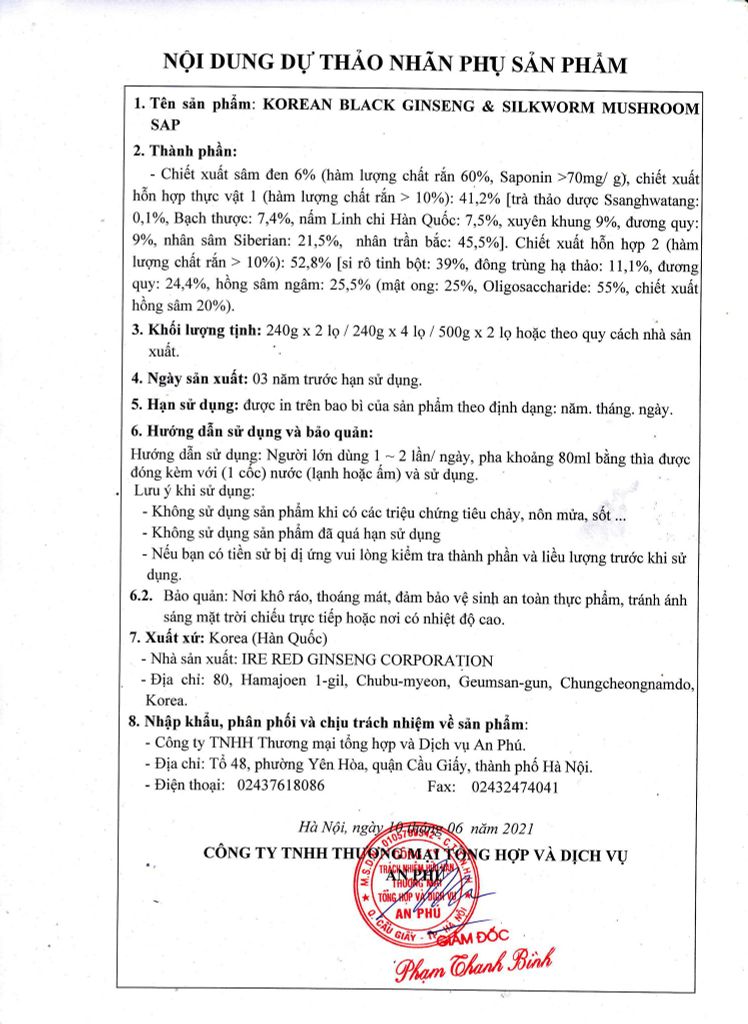 - Chiết xuất hắc sâm 6% (hàm lượng chất rắn 60%, Saponin > 70mg g), đông trùng hạ thảo 11,1%.
