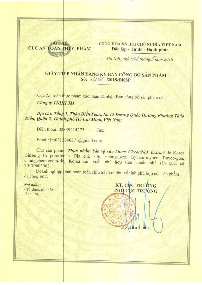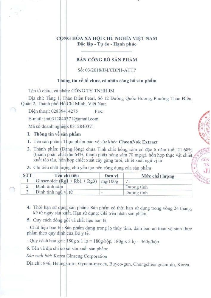 Tinh chất chiết xuất Hồng sâm Hàn Quốc (Thiên sâm) 6 năm tuổi 21,68%, Chiết xuất Nhung hươu New Zealand 10,12%, Fructo oligosaccharide 50,84%, Indigestible Maltodextrin, Chiết xuất Hoàng kỳ, Hỗn hợp thảo dược độc quyền (Bạch thược, Chiết xuất Đương quy Hàn Quốc, Quế chi, Bạch truật, Cam thảo, Địa hoàng, Xuyên khung Hàn Quốc, Trần bì), Chiết xuất Đương quy Hàn Quốc, Nước ép táo đỏ cô đặc, Chiết xuất Hoàng cầm, Chiết xuất Gừng, Ngũ vị tử.