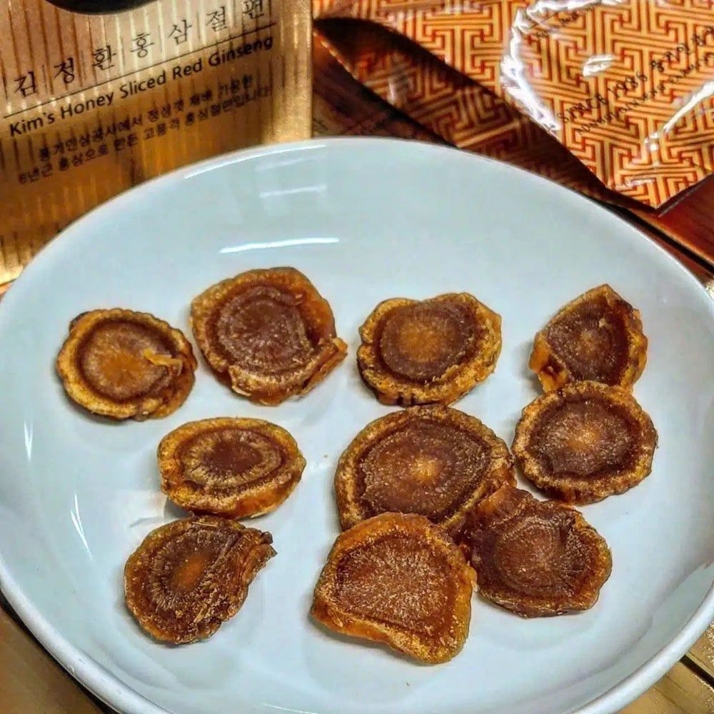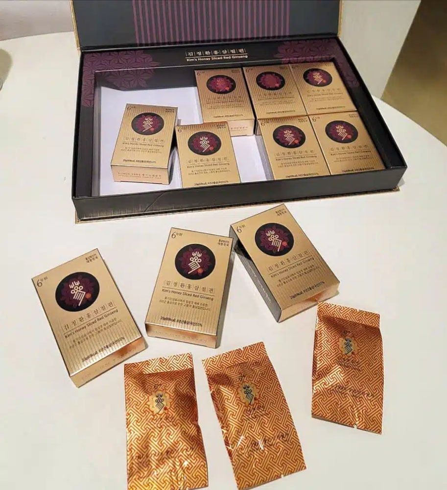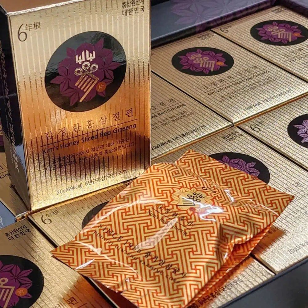 Hồng sâm tẩm mật ong nguyên củ là Hồng sâm 6 năm tuổi được chế biến bằng phương pháp hấp cách thuỷ, sau đó tẩm mật ong rừng nguyên chất với thành phần hồng sâm chiếm 70% cùng với 25% fructose từ mật ong hàn quốc và Oligosaccharide 5%.
