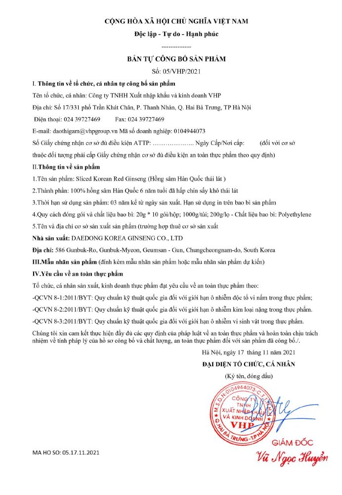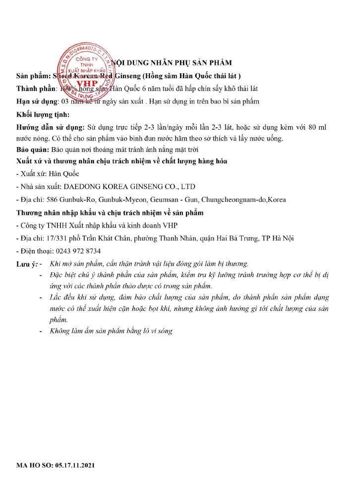 - 100% nhân sâm Geumsan Hàn Quốc qua 3 đến 4 lần hấp sấy ở nhiệt độ thấp thành hồng sâm củ khô nguyên chất, được sấy khô thái lát sẵn.