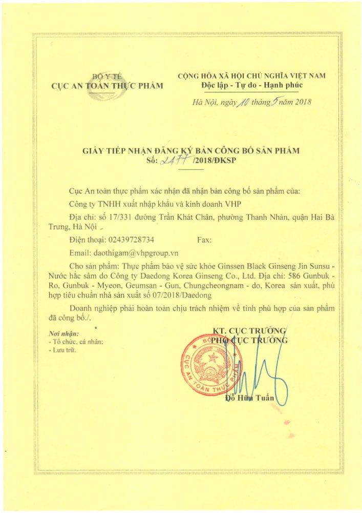 - Chiết xuất hắc sâm (hồng sâm hàn quốc) chiếm 100% (1,7 mg/g, hàm lượng chất rắn 1,7% trở lên, trong nước).