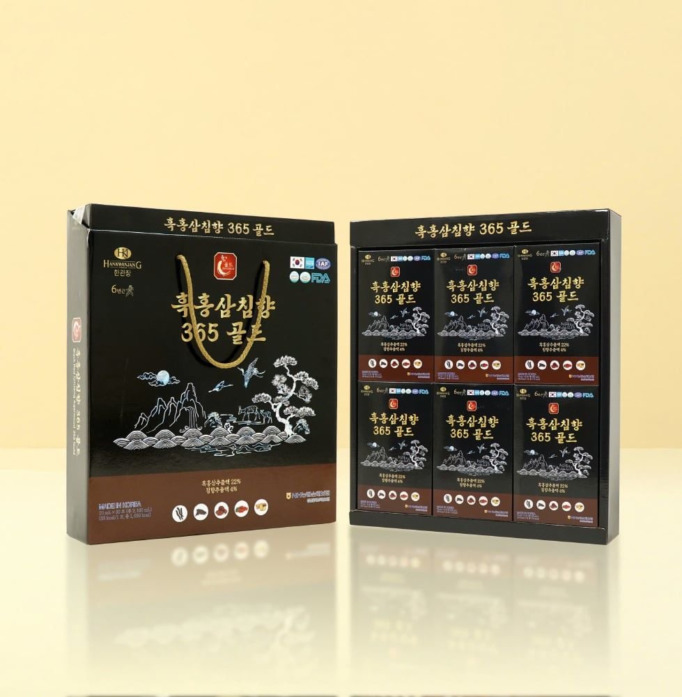- Premium 6-Year-Old Black Red Ginseng Gold tự hào với thành phần hắc hồng sâm Hàn Quốc 6 năm tuổi - một loại nhân sâm đặc biệt trải qua 9 lần hấp sấy công phu, giúp tăng cường hàm lượng saponin, tạo nên khả năng chống oxy hóa và kháng khuẩn tuyệt vời. Saponin từ hắc hồng sâm không chỉ giúp tăng cường hệ miễn dịch mà còn cải thiện sức đề kháng, giảm nguy cơ mắc bệnh và giúp cơ thể phục hồi nhanh chóng sau khi mệt mỏi.