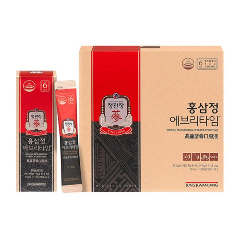 Nước Hồng Sâm Cao Cấp Everytime có quy trình đóng gói bao gồm một hộp lớn, bên trong chứa 3 hộp nhỏ, 3 hộp nhỏ lại chứa thêm 10 gói sâm - mỗi gói sâm có thể tích thực là 10ml.