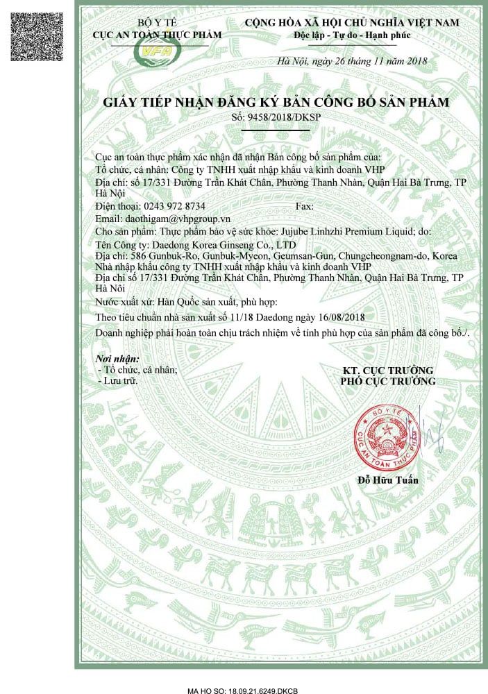 Nước tinh khiết, chiết xuất linh chi (thành phần rắn lớn hơn 60%, trong nước) chiếm 7%; chiết xuất táo đỏ (thành phần rắn lớn hơn 60%, trong nước) chiếm 5%; thành phần hỗn hợp (nấm linh chi (trong nước); hoàng tinh (trong nước); đỗ trọng, hoa mẫu đơn trắng, nấm phục linh; trần bì, hà thủ ô đỏ, địa hoàng, sắn dây, mâm xôi, kỷ tử, rễ đương quy; quế chi)