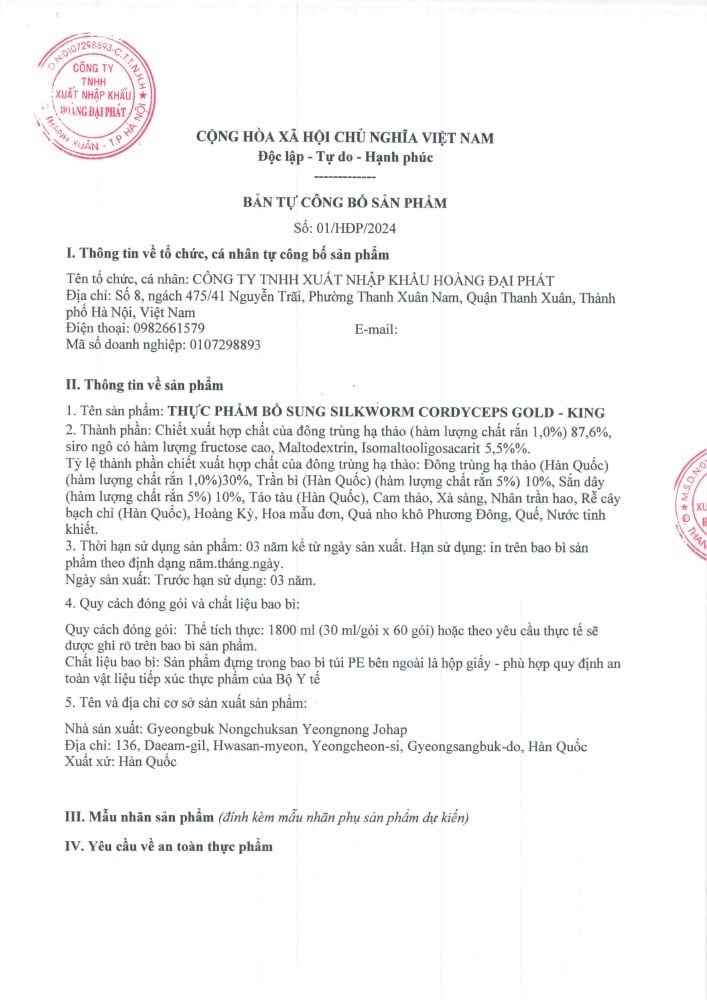 Chiết xuất Đông trùng hạ thảo 87,6%, tỷ lệ phối trộn chiết xuất đông trùng hạ thảo (Silkworm Cordyceps Militaris) là: Peacilomyces Japonica (Hàn Quốc, thành phần chất rắn 1%) chiếm 30%, chiết xuất vỏ quý cam khô Hàn Quốc (thành phần rắn 5%) chiếm 10%, Pueraria lobata (thành phần rắn 5%) chiếm 10%, chiết xuất táo đỏ Hàn Quốc, cam thảo, cindium, Artemisia Capillaries, Sâm Angelica Hàn Quốc, Milk vetch root (gốc cây đậu tằm Hàn Quốc), Peony, Quả Hovenia dulcis, Cinnamon (Quế), nước tinh khiết.