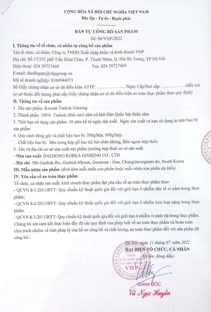 - 100% củ sâm Taekuk (Thái Cực Sâm) lớp Thiên Sâm cao cấp, được trồng và thu hoạch tại vùng Geumsan - thủ phủ sâm Hàn Quốc.