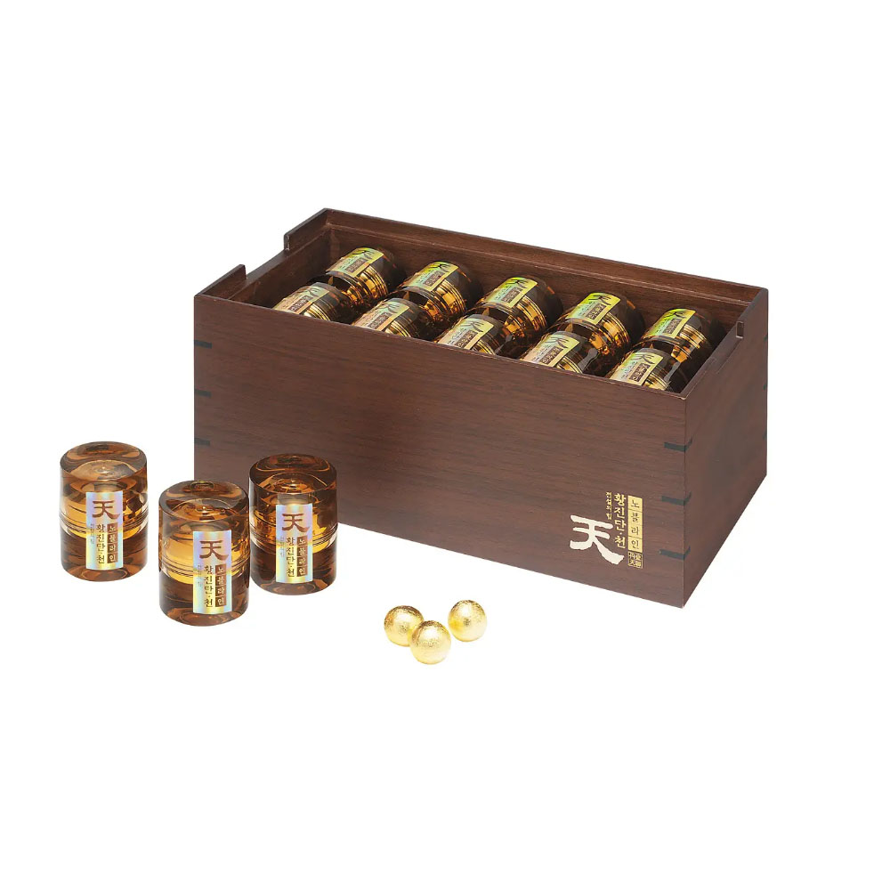 Hồng sâm (thiên sâm top 0.5% cao nhất) 38,33%, nhung hươu New Zealand 0,75mg/1 viên, vàng lá 8,5%, rễ bạch chỉ, sữa ong chúa, cây xô thơm tự nhiên.